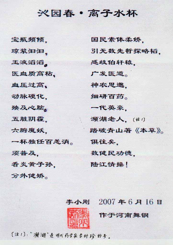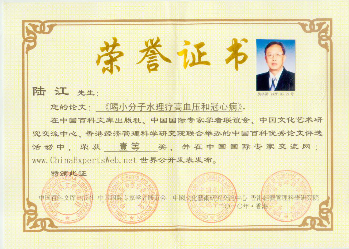 -----我是從事建筑的高工,本來(lái)沒有資格去攻克醫(yī)學(xué)難題,卻為了自身健康才扣響醫(yī)學(xué)的大門。由于我1990年患高血壓,因怕中風(fēng)才研究發(fā)明了離子水瓶,我把水處理成微小分子團(tuán)水,飲用后治愈了高血壓。便于1993年底送到三家省級(jí)醫(yī)院做臨床試用4個(gè)月。經(jīng)北京和廣西醫(yī)學(xué)專家鑒定:"降脂降壓效果好"," 能擴(kuò)大心腦動(dòng)脈流量,改善心腦電圖以及微循環(huán)","對(duì)治療心腦動(dòng)脈粥樣硬化、高血壓、高血脂有良好的醫(yī)療保健作用。""產(chǎn)品的技術(shù)性能和療效達(dá)到了同類產(chǎn)品的國(guó)內(nèi)領(lǐng)先水平,經(jīng)廣西醫(yī)學(xué)科學(xué)情報(bào)研究所檢索,未見國(guó)外有類似報(bào)道。"中國(guó)醫(yī)學(xué)科學(xué)院張正國(guó)教授從美國(guó)國(guó)立醫(yī)學(xué)圖書館數(shù)據(jù)庫(kù)存Medline檢索英俄文資料,均未見類似報(bào)告。2000年上市后,我為了對(duì)消費(fèi)者負(fù)責(zé)而繼續(xù)觀察研究,一直通過《信譽(yù)卡》和《質(zhì)量跟蹤調(diào)查書》向患者承諾療效,請(qǐng)用戶使用6個(gè)月后反饋效果。和脂壓患者飲用2至5個(gè)月內(nèi),消除癥狀,停服藥物,血壓正常;冠心病患者飲用3~5個(gè)月逐漸減輕至消除心絞痛、房顫等癥狀,不再服藥,飲用1年左右心電圖正常,經(jīng)冠脈造影掃描無(wú)明顯狹窄,表明冠心病痊愈。大量患者還反映許多衰弱器官被修復(fù),讓前列腺增生、慢性咽喉炎、慢性氣管炎、支氣管炎、慢性胃炎、腸炎和膽囊炎等不藥而愈;2型糖尿病患者是因?yàn)橐葝u衰弱致病,飲用該水半年至一年,逐漸減藥至停藥,血糖尿糖正常,真正治愈2型糖尿病。中風(fēng)后遺癥患者飲用六七個(gè)月,可逐漸減輕至消除肢體和語(yǔ)言障礙,表明飲用該水能讓壽命很長(zhǎng)的神經(jīng)元細(xì)胞逐漸修復(fù),奇跡般地恢復(fù)肢體和語(yǔ)言功能。飲用后還使胸腺和脾臟兩個(gè)重要的免疫器官被修復(fù)和增強(qiáng),產(chǎn)生免疫細(xì)胞多,提高了免疫力,使人不生病或少生病。自此, 飲用微小分子團(tuán)水創(chuàng)造了攻克冠心病、高(低)血壓和糖尿病三大醫(yī)學(xué)難題的奇跡。人們對(duì)此感到不可思議,但實(shí)踐是檢驗(yàn)真理的唯一標(biāo)準(zhǔn)。